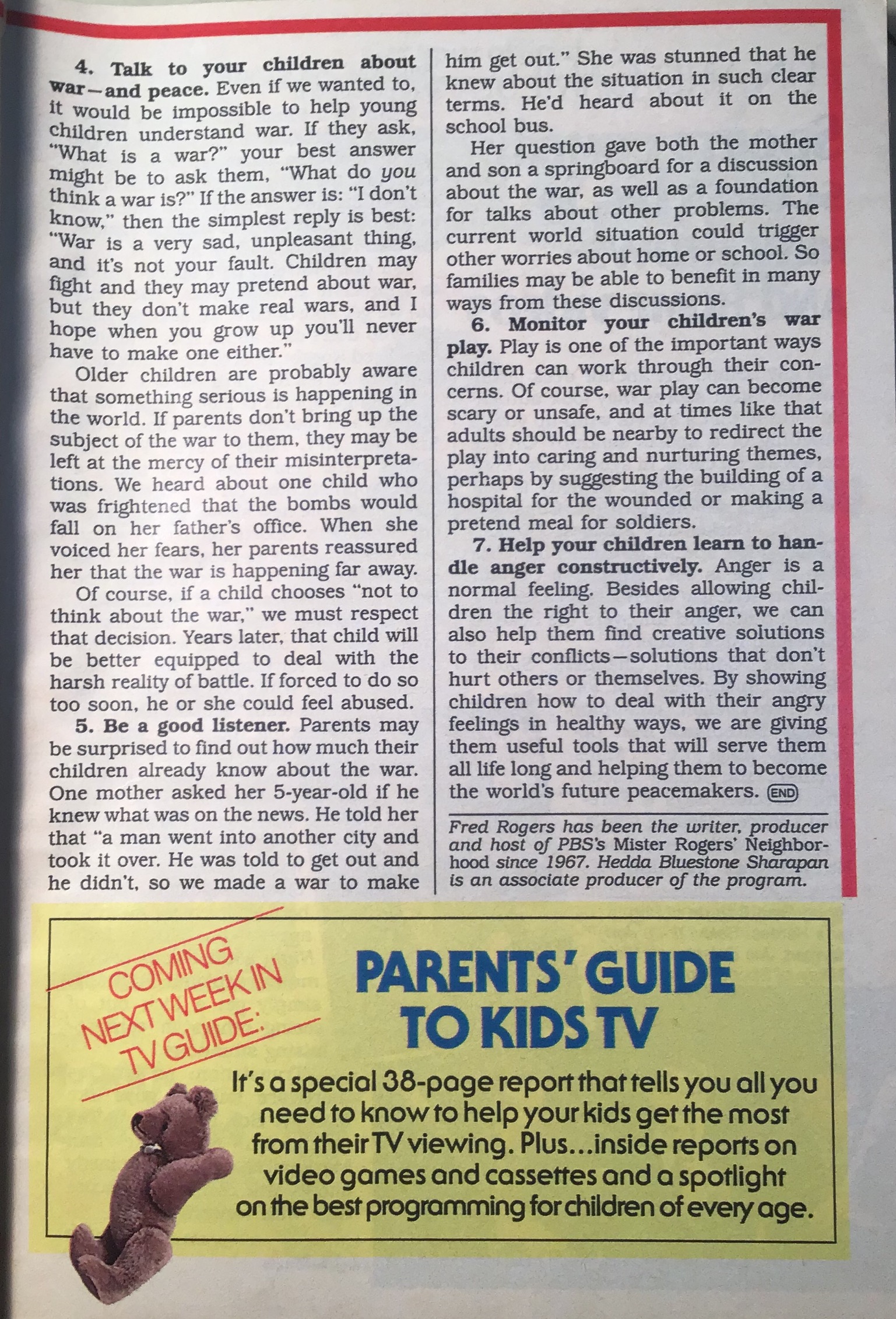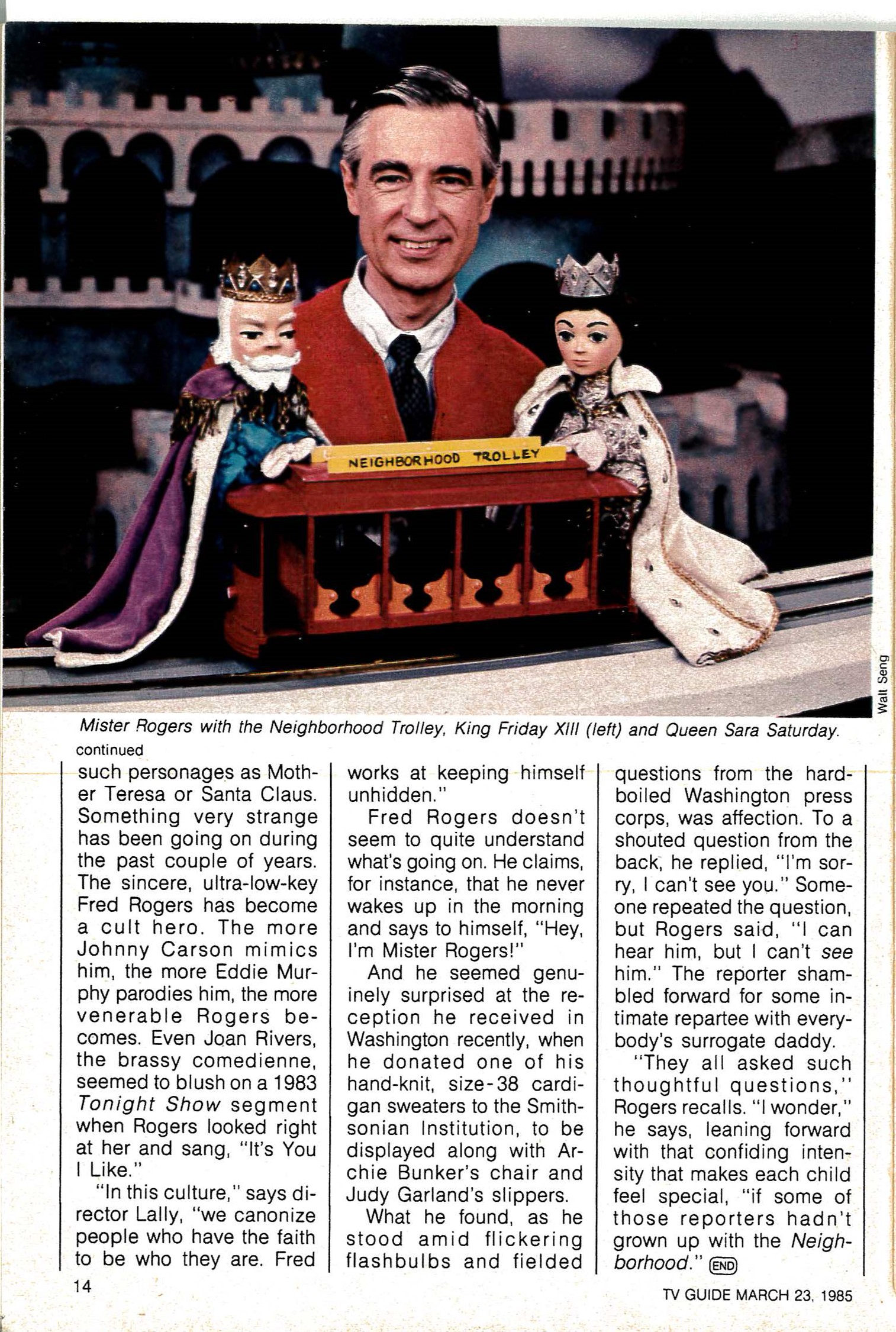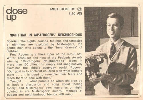 Special: The sights, sounds, feelings and fantasies of nighttime are explored by Misterogers, the gentle man who caters to the "inner dramas" of children. Fred Rogers is a Pied Piper of the 3-to-8 set. Writer, producer and host of the Peabody Award-winning "Misterogers' Neighborhood" (seen in more than 100 cities), he simply and imaginatively examines the child's everyday world. Rogers: "Our goal is to confront children with what bothers them...it is good to re-evoke their fears and teacher them to deal with them." Tonight...what parents do when children go to bed; a discussion and song about feeling lonely; and Misterogers' own memories of night. Joining in are Misterogers' colorful menage of puppet and neighborhood friends. (60 min.) [This feature previews a one-hour special which aired on NET on November 24, 1969. Therefore, this clipping most likely appeared in the November 22-28,1969 issue of TV Guide.] Title: He Reaches Into Kids' Souls