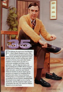Title: 50 Greatest TV Stars of All Time For almost 30 years now, Fred Rogers -- that's Mister Rogers to you -- has entered his house and performed the same ritual: shedding the garments of the outside world, covered, as they are, with the soot of worry, fear, and other harsh realities. In their place, he puts on a well-worn cardigan and those comfy sneakers...and we slip into them, too. The soothing star of PBS's Mister Rogers' Neighborhood makes us, young and old alike, feel safe, cared for, and valued, while he teaches us about what's good, and gives us support in handling all the bad that takes place beyond his door. Nothing fancy, no hyperkinetic cartoons, no pressure on us to achieve amazing feats. His simple home might not be a wacky playhouse, and the puppets might sound remarkably like him, but wherever Mister Rogers is, so is sanctuary. |