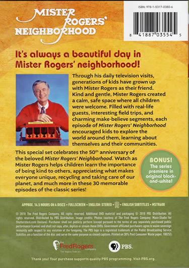 NotesOn initial versions of this DVD set, the bonus episode mentioned on the package as the "series premiere in original black-and-white" was actually the first color episode from 1969. Additionally, "Food and Love Go Hand in Hand" was listed in the packaging as the last episode on Disc 1 but was actually the first episode on Disc 2 and "Respecting All Living Creatures" was listed in the packaging as an episode on Disc 1 but was not included on the disc itself. These errors were corrected and replacement copies were provided by PBS to those who purchased this initial set. On the original version of this set, the second episode on Disc 4 was "Needing Help and Giving Help" (1705). When the corrected version was released, this episode was replaced with "Wondering and Asking Questions" (1754). Other collections of Neighborhood episodes released by PBS: