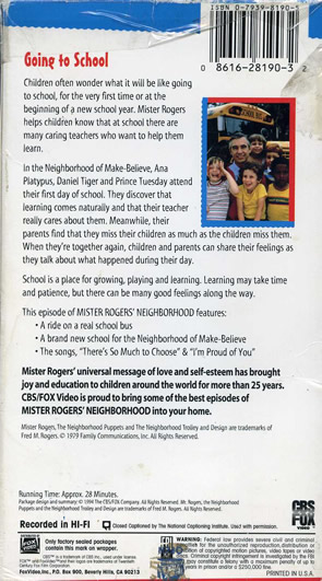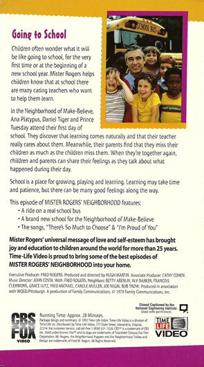NotesThe episode featured on this video is Episode 1465 from the Goes To School series. The packaging for the CBS/Fox version of this video included a special mail-in offer for a fun sized Trolley. [Image 1] [Image 2] CreditsWith Fred Rogers Produced in association with WQED/Pittsburgh Original funding for Mister Rogers' Neighborhood was provided by Public Television Stations and The Sears-Roebuck Foundation. |