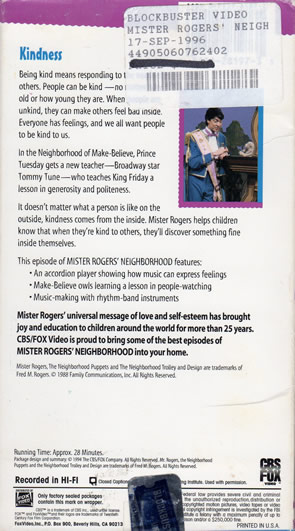 NotesThe episode featured on this video is Episode 1595 from the Kindness & Unkindness series. The packaging for the CBS/Fox version of this video included a special mail-in offer for a fun sized Trolley. [Image 1] [Image 2] CreditsWith Fred Rogers Produced in association with WQED/Pittsburgh |