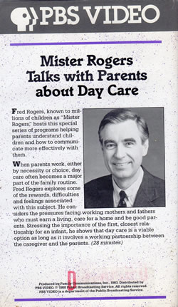 Produced by Family Communications, Inc., 1983. Distributed by PBS VIDEO. DescriptionOriginal air date: April 24, 1983 Filmed in the studios of WQED / Pittsburgh, Mister Rogers Talks With Parents About Daycare features the expert opinion of Fred Rogers as he discusses this topics with parents and educators. This thirty-minute special includes visits to multiple daycare centers where Fred Rogers talks with the director, teachers, and parents about daycare. Topics include separation anxiety for both children and parents, a child's adjustment to the daycare environment, and how to select the proper day care option. Guests